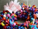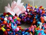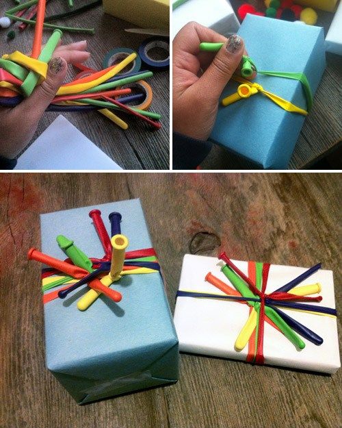 Вы можете заменить упаковочную ленту и бант, красочными воздушными шарами (вы должны использовать длинные и тонкие шары). Очень оригинально, не так ли?