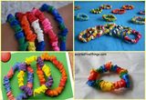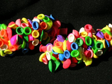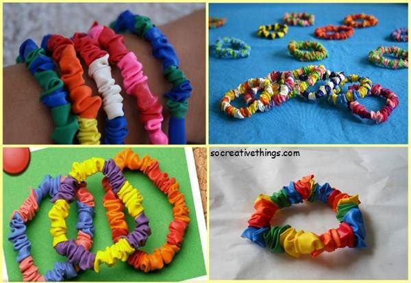 Обрежьте концы каждого воздушного шара, используйте тонкие и длинные шары. Нарежьте шары полосками проденьте через шары шнур-резинку, концы завяжите узлом. Ваш браслет готов! Количество воздушных шаров и размер шнура, зависит от размера руки ребенка.