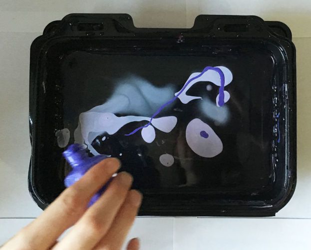 Заполните контейнер теплой водой. Добавьте по капле лака для ногтей того цвета, который выбрали, в контейнер, как показано ниже.