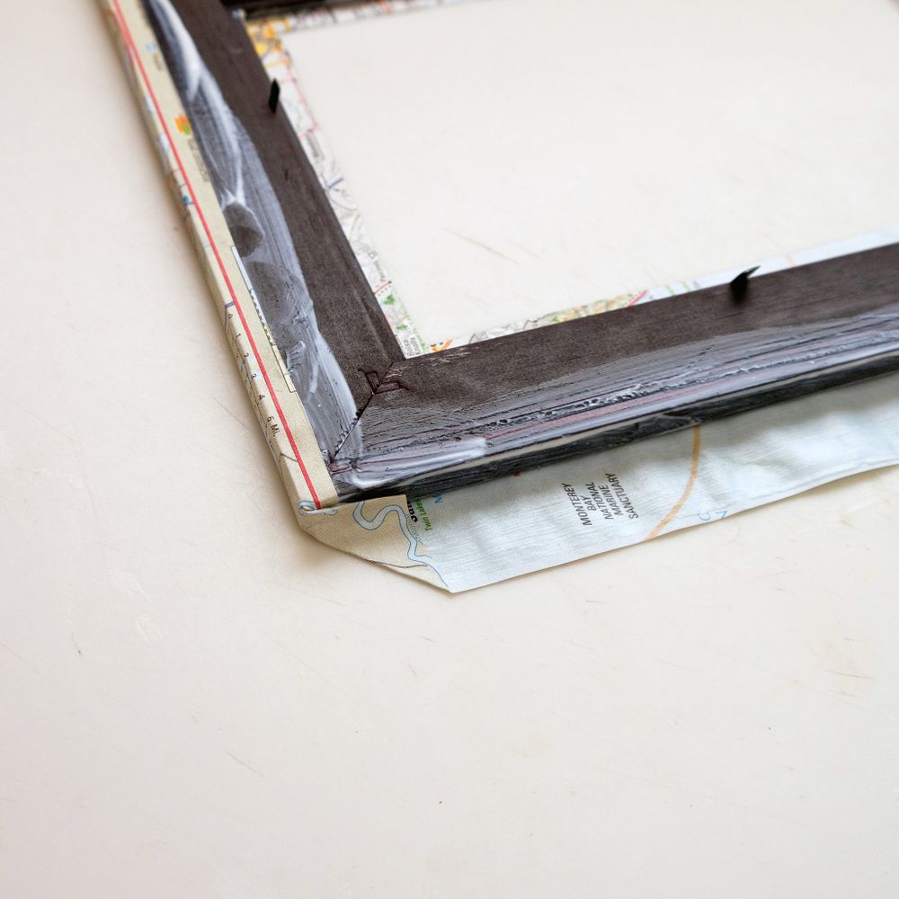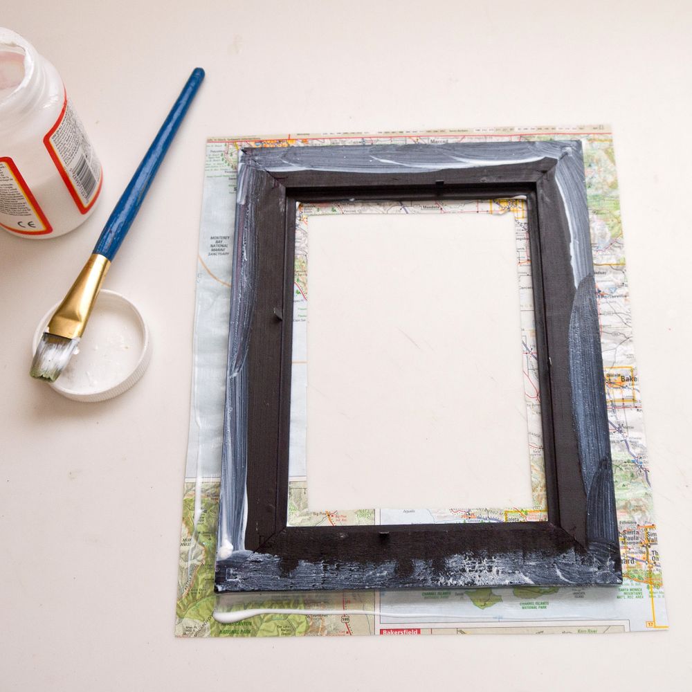 1.Для этого подойдет рамка любого размера. Бережно снимите стекло с рамки, отложите на время в сторону. Рамку расположите на лист атласа или карты. При помощи линейки обведите рамку с отступом около 1 см с внутреннего края, и 2 см с внешнего края рамки. Ножницами вырежьте по двум контурам.