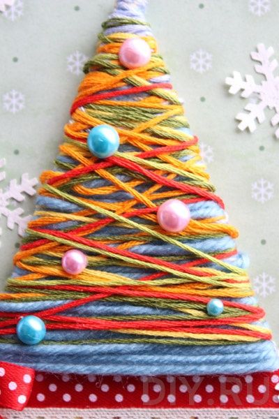 Согните картон пополам, а затем вырежьте из плотной бумаги прямоугольничек и приклейте его сверху открытки. Теперь вам нужно вырезать из 3-го листа треугольник, который затем обмотайте с помощью цветной пряжи. Закрепите нитки с тыльной стороны фигурки. После этого вам понадобятся бусины разных цветов и ленточка, благодаря которой елочка на открытке станет еще наряднее и ярче! Украсьте деревце бусинами и ленточкой. И теперь вам остается лишь написать пожелания и приклеить их к открыточке. Готово! Радуйте своих близких как можно чаще и дарите им свою заботу, внимание и любовь!