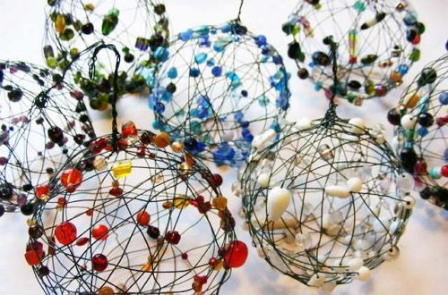 3. Проволоку с бусами обмотать вокруг шара, при этом поправляя бусы, чтобы они элегантно смотрелись и ровно легли. Когда проволока прошла сквозь хвостик шара, скручивайте ее и продолжайте дальше. Чтобы шарик не лопнул, не следует обтягивать его очень туго.