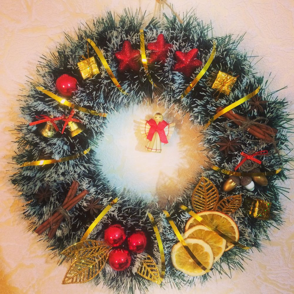 Социальная сеть была заполнена разными вариантами новогодних веночков, которые можно сделать дома самому без особых трудов, вот и я решила попробовать, сделала мамам и бабушке. Получилось очень даже симпатично и необычно. Впервые опробовала в декоре высушенные апельсины и бадьян (давно хотела это сделать)