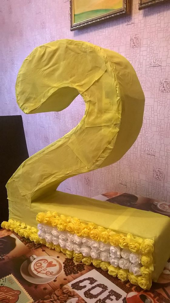 Всем привет! решила опубликовать, как я делаю объемную цифру 2. Скоро у сынишки День Рождения и вот меня тоже осенило порадовать и его и всех моих близких вот таким замечательным творением. Делаю я эту цифру если честно в 1 раз, но думаю вполне продуктивно) Каркасом служит плотный картон, из которого я вырезала собственно говоря саму цифру, при том два раза, ведь циферка у меня должна была получиться объемная, в итоге я все - таки все скрепила благодаря всемогущей силе скотча и вуаля цифра стала нереально большой и объемной, так как и хотела я. Следующим этапом стало то, что всю двоечку я обклеила гофрированной бумагой, чтобы не было видно самого картона и чтоб смотрелось наиболее эстетично что ли) Ну и сейчас я работаю над самими розочками, сразу их приклеиваю, чтоб подбодрить себя видеть и свою работу, а работа еще какая оказывается, вот кто делал меня поймет. Ну все, спасибо за внимание и что прочитали, захотите комментируйте, я буду рада пообщаться.