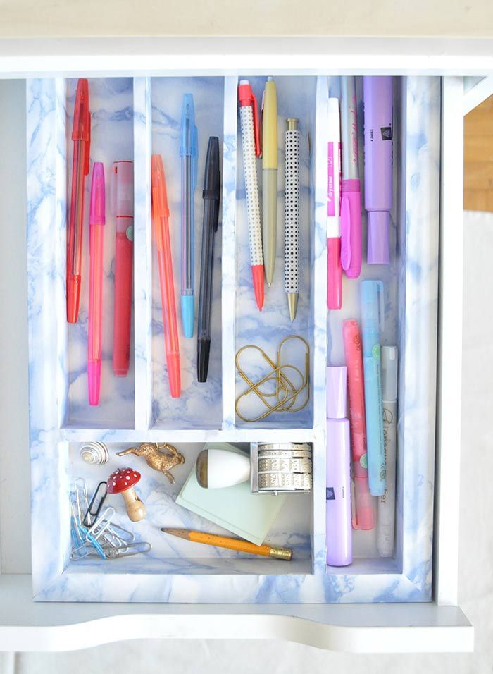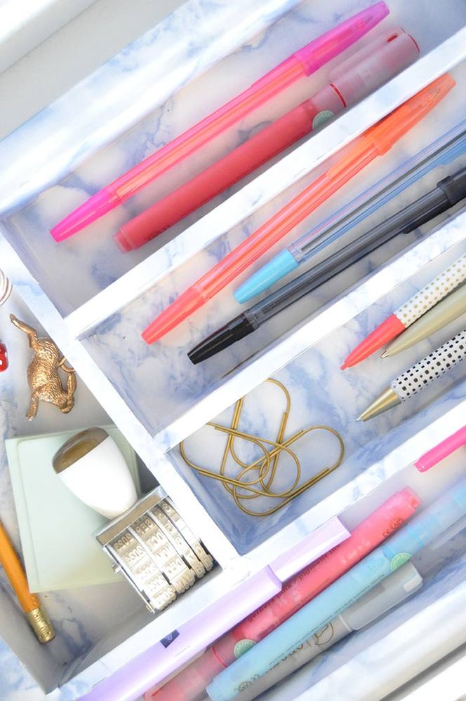 Шаг 1: Начните с разрезания куска контактной бумаги, чтобы куски подходили по размерам к ящику. Используйте линейку для измерения длины и ширины отсека и нарисуйте это на обратной стороне контактной бумаги. Добавьте несколько сантиметров на каждую сторону, чтобы наклеить бумагу по всей глубине отсека, покрывая всю внутреннюю поверхность.