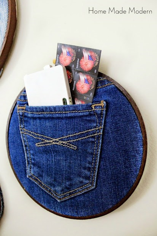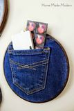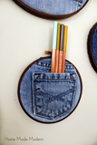 Ребята, это довольно просто, так что нет необходимости сходить с ума и расписывать шаг за шагом ход выполнения работ. Просто покрасьте внешние обручи (те, что с винтами) коричневым или любым другим цветом, каким вы хотите. Мы выбрали коричневый цвет, потому что он напоминает цвет кожаного ремня. Вы знаете, ... для джинсов. После того, как внешние обручи пялец, высохли, поместите в них свои джинсовые карманы, чтобы увидеть, где отрезать их от остальной части брюк. Просто убедитесь, что они могут быть достаточно хорошо натянуты в пяльцах. Поместите ткань между внутренними и внешними обручами и винтом стяните все это, пока ткань хорошо и плотно не ляжет. Наконец, обрежьте излишки джинсовой ткани. Или немного другая идея, здесь придется использовать шитье.