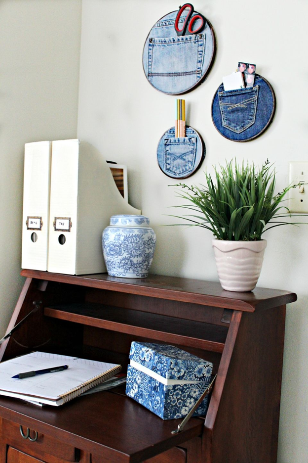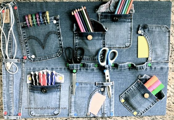 Привет всем! Конечно, нельзя отрицать, что джинсы сегодня являются одним из основных составляющих гардероба. Каждый человек имеет по крайней мере одну пару джинсов в шкафу, если не несколько разных стилей и брендов. Джинсовая одежда идет всем! Возможно, именно поэтому это одна из самых горячих тенденций домашнего декора в этом году. Для тех, кто любит джинсы, вы можете сделать что - то, полезное, используя любимые джинсы. Так что делюсь идеей, как использовать карманы из нескольких старых пар, чтобы сделать органайзер для вашего рабочего места.