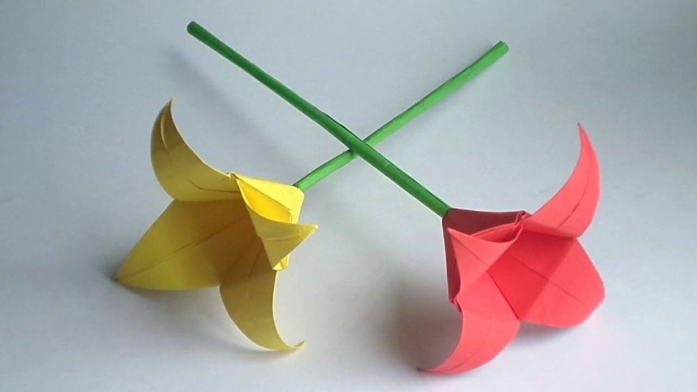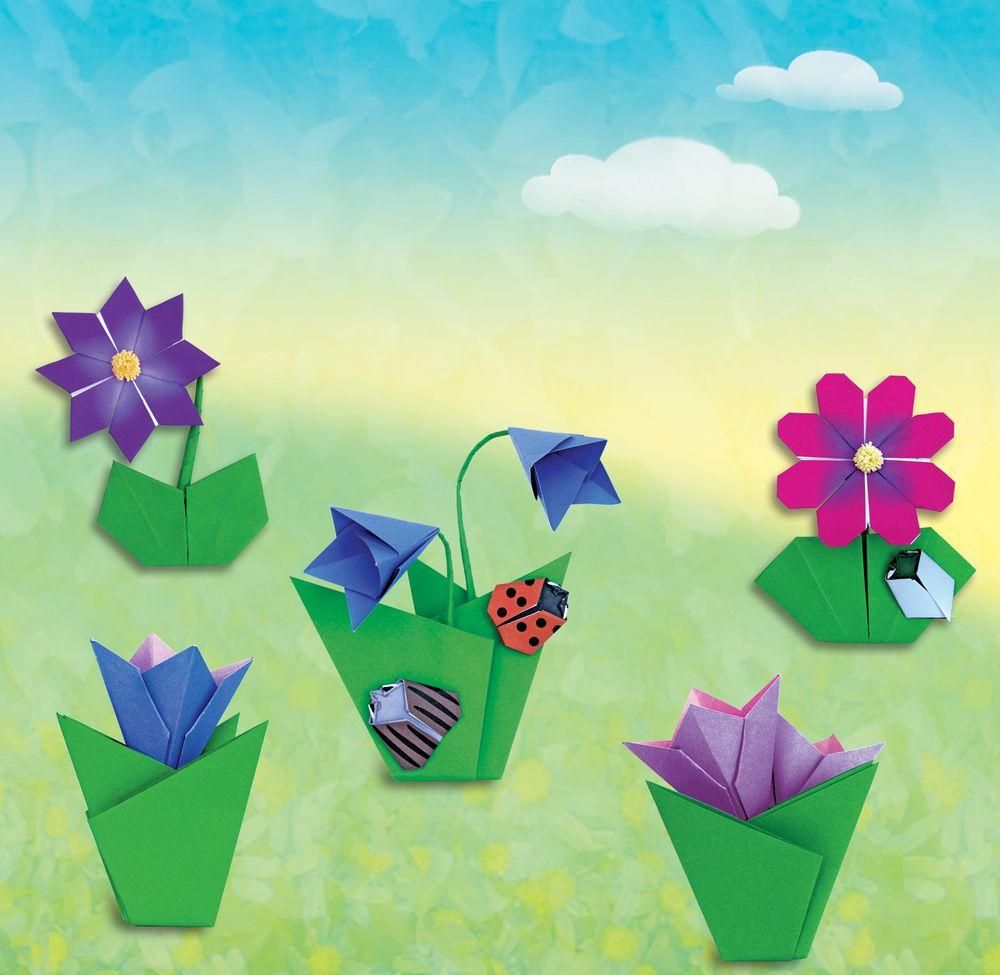Для каждого цветка приготовьте: для листьев — 1 квадрат из зелёной бумаги; для лепестков — 4 маленьких квадрата из цветной бумаги; для стебля — полоска зелёной бумаги. Из всех квадратов сложите детали, выполнив действия 1–9, как для фигурки ёлки.
