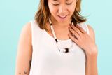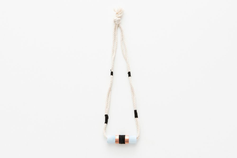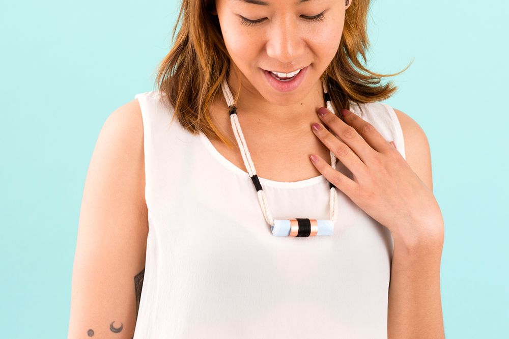 Сложите веревку вдвое нужной длины и заведите вовнутрь ролла. Концы веревки свяжите простым узлом. Добавьте детали, какие как на кулоне, обернув участки веревки нитью для вышивания. Добавьте два цветовых блока по обе стороны от кулона.