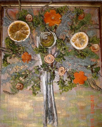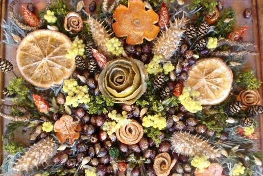 Для изображения листвы, цветов и плодов вашего сказочного дерева подойдут абсолютно любые материалы. Это могут быть любые мелкие соцветия или семечки, шишечки ольхи, коробочки дурмана, произвольные элементы, вырезанные из кожуры апельсина или лимона и даже целые небольшие стручки засушенного острого перца.