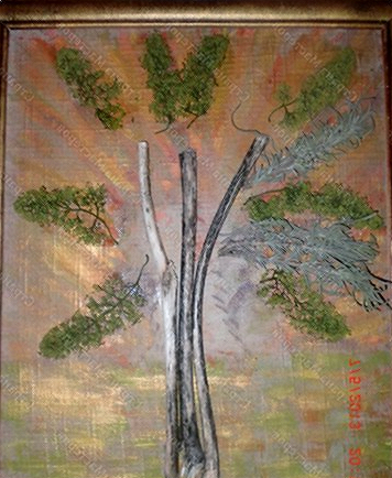 Прежде всего, необходимо выложить ствол деревца. Для этого можно использовать тоненькие веточки любого растения. Очень выигрышно смотрится «древесный ствол», выложенный косточками финика. Все элементы композиции крепятся непосредственно к ткани-фону при помощи клеевого пистолета.