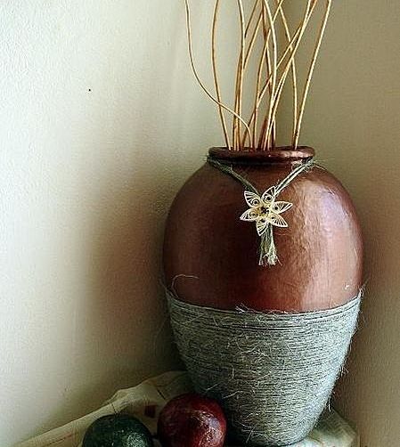 Далее будет самое интересное - декор. В данном мастер-классе веревка, окрашенная с помощью губки, является элементом украшения. Но вы можете придумать сами, как украсить вашу вазу, использовать можно бусины, бисер, кожаные элементы и пр, главное не забывайте проклеивать места вазы под декор.
