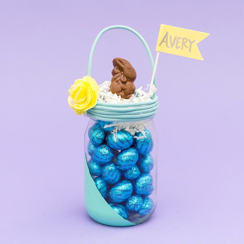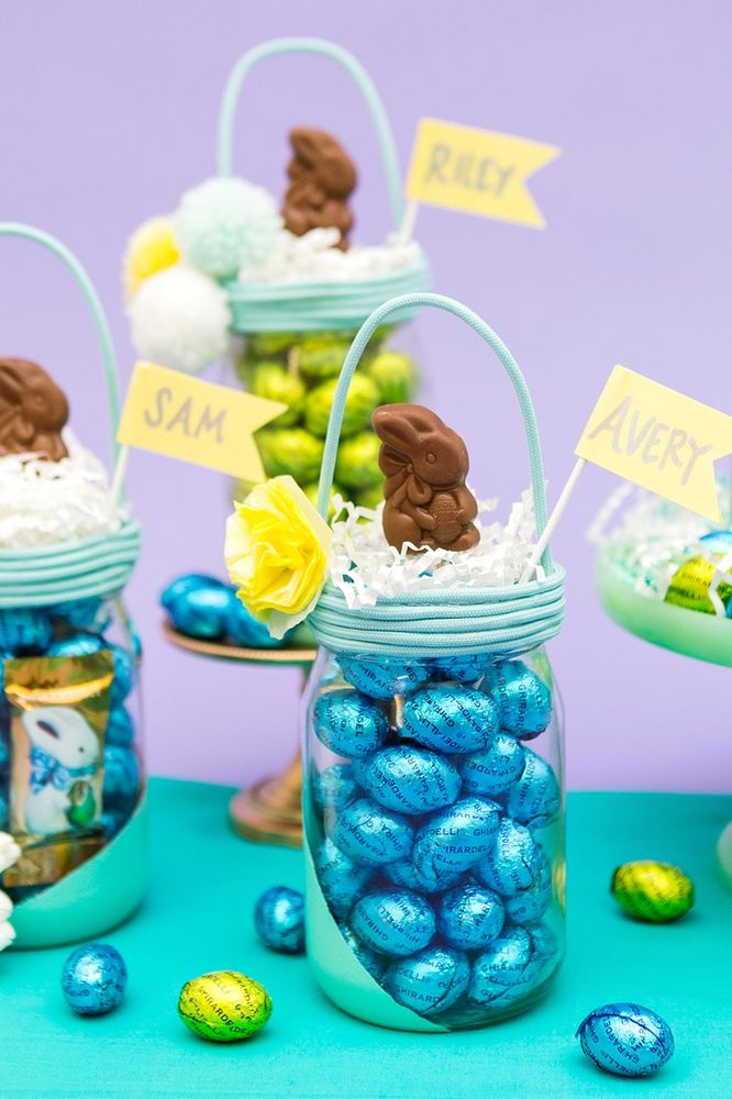Заполненные изобилием вкусностей, они отличный способ разделить этот праздник с вашими малышами. Сделайте новый вид корзины и заполните ее шоколадом. Много и много шоколада! Легкий и красочный проект, эта стеклянная банка перевоплощенная в корзинку это как раз то, что кролик заказал!