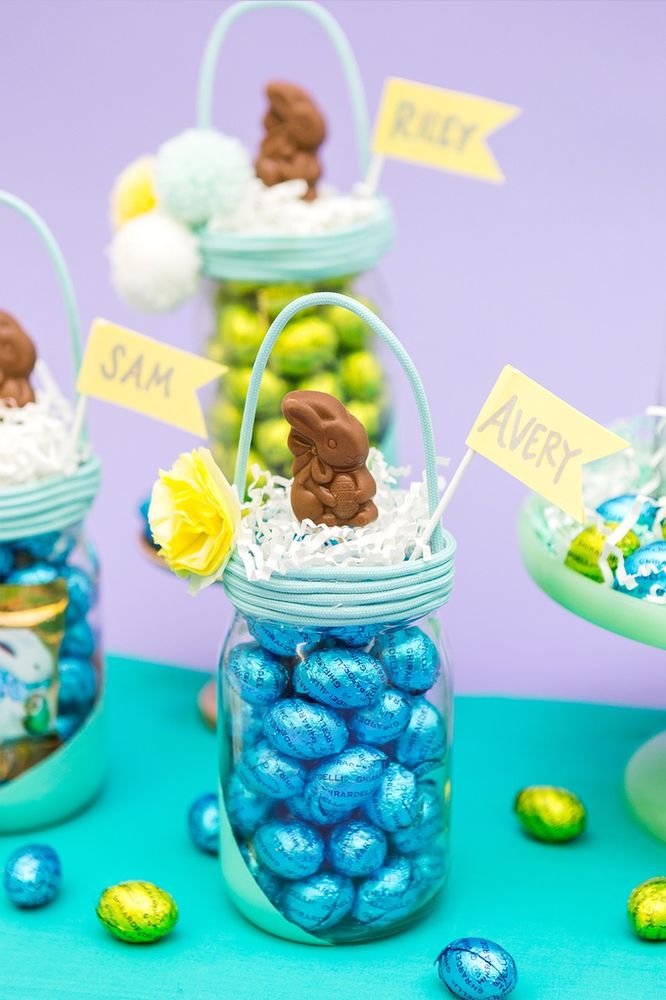 Вы можете добавить различные украшения, такие как помпоны или шелковые ленты, чтобы перепрофилировать эти банки, в восхитительные корзинки для детей.