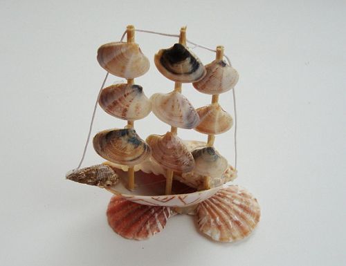 Теперь приступим к созданию красивых парусов из мелких ракушек. Крепить их будем жидким клеем. Необходимо расположить раковины в одинаковом порядке, то есть так, чтобы их округлая часть была направлена строго вниз. Обычно на одной балке должно поместиться от трех до шести ракушек. Все будет зависит от размера самой поделки.