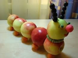 Это совсем просто. Понадобятся только яблоки (разноцветные, все одинакового размера и одно побольше), маленькая морковка и зубочистки. Чередуя цвета, скрепите яблоки зубочистками. Голову сделайте из более крупного яблока, глазки и носик – из моркови.Можно даже сделать сороконожку, если внизу повтыкать веточки или зубочистки. А еще можно сделать аксессуары: шляпу из цветной бумаги или бусы из рябины.