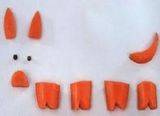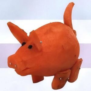 Избавляем морковку от узкой части и при помощи ножа закругляем широкий край. Другая морковка пригодится для вырезания пяточка, ушек, копытца и хвостика. Дальнейшая сборка предполагает закрепление зубочистками пяточка на узком краю заготовки, а под ним делаем рот. Зубочистками с двух сторон закрепляем ножки и фиксируем ушки. В качестве глазок будут выступать горошинки черного перца. Хвостик закрепляем сзади.