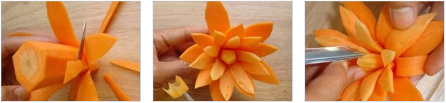 Для изготовления восхитительных цветов из моркови может использоваться техника карвинг. Данное искусство состоит в художественной резке по продуктам растительного происхождения и прочим природным материалам, к примеру, дереву, льду и камню.