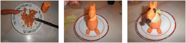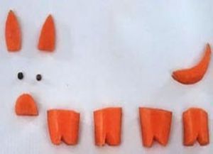Из одной моркови вырезаем лапки, хвост и мордочку с ушками, а из другой – туловище. Далее складываем фигурку лисы путем ее аккуратного выкладывания на тарелке. Остается только зафиксировать элементы спичками либо зубочистками. Нос и глаза делаем из чернослива, а для воротника выбираем капустный лист.