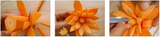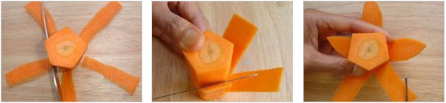 Берем одну морковь среднего размера и делаем из этого овоща пятиугольник. Прорезаем вдоль каждой грани «лепестки» цветка, при этом нож до самого конца не опускаем. Срезаем по краям лепестков уголки, придавая им остренькую форму. Далее аналогичным способом вырезаем лепестки, причем делаем это в шахматном порядке. Затем оставшаяся серединка заостряется и цветочный шедевр создан!