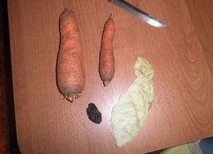 Для изготовления поделки лисы берем 2 морковки, чернослив, капустный лист и нож.