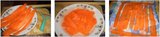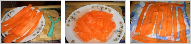 Берем длинную и в меру толстую морковь для нарезки ее на пластины при помощи овощечистки. Для придания моркови эластичности опускаем этот овощ в соленую воду буквально на несколько минут. Затем выкладываем его на полотенце для впитывания влаги.