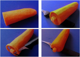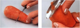 После чистки средней по величине моркови отрезаем от нее прямой кусок. Для создания квадратного «хвостика» будущей шишки используем нож, которым также придаем данному овощу овальную форму.