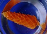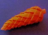 Далее по кругу заготовки вырезаем чешуйки, причем начинаем это делать с толстого края моркови. Глубина прореза может достигать 2-3 мм. Для создания объемного изображения первого ряда срезаем морковь по направлению вниз по конусу. Далее в шахматной порядке вырезаем чешуйки. Причем для следующего ряда каждый раз снова подрезаем площадку.