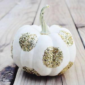 Нанесите с помощью кисточек клей ПВА на вашу тыкву, а с помощью спонжа на участки с клеем нанесите блестки. На заметку* с узорами можете экспериментировать, пробуйте нарисовать всякие линии, фигурки и т.п. Еще можете вместо клея ПВА и блесток, тыкву разрисовать акриловыми красками, как пожелает душа.