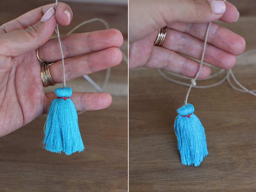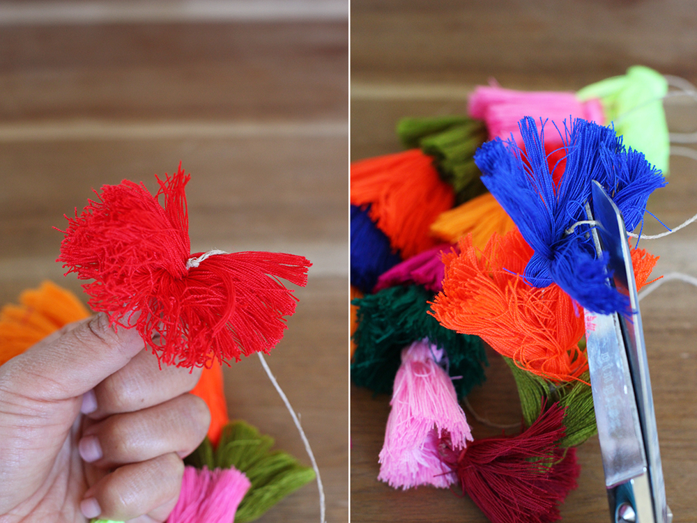 Вы можете купить готовые хлопковые кисточки или изготовить их самостоятельно. Если вы покупали готовые кисточки вспарывателем удалите прикрепленную нитку к верхней части каждой кисточки.
