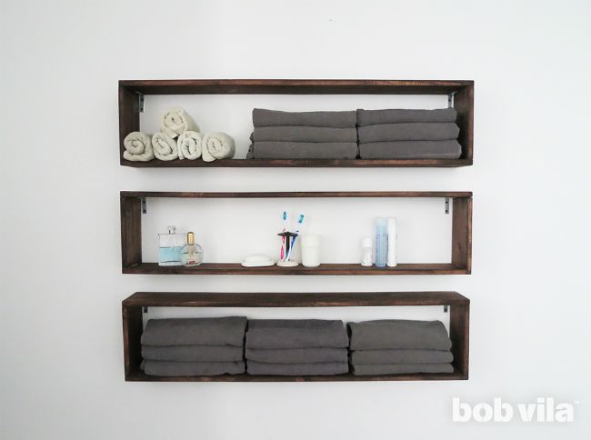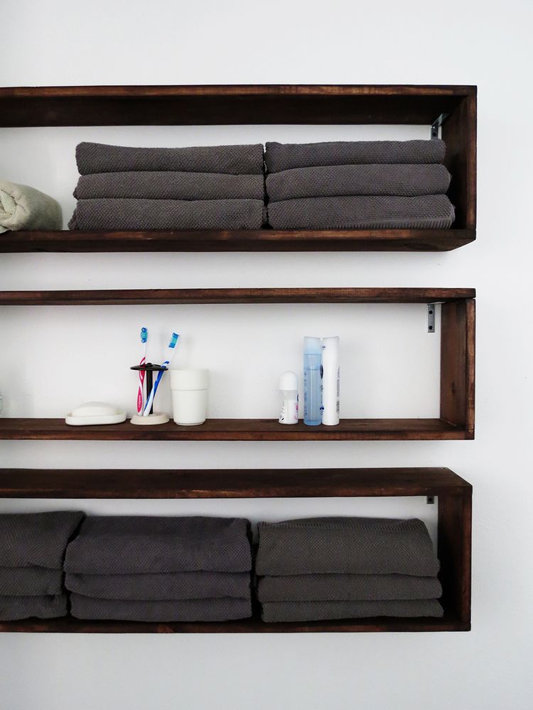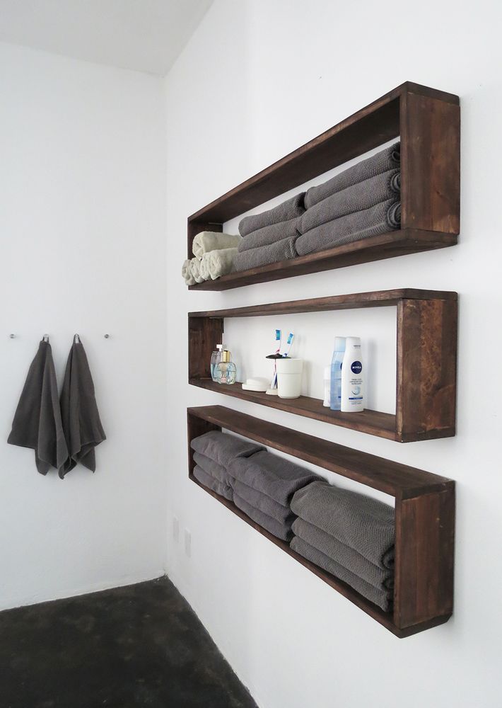 Пустая стена прекрасная возможность содержать в порядке ваши туалетные принадлежности, если вы сделаете и смонтируете этот простой набор деревянных полок двойной, или даже тройной для хранения мелочевки в вашей ванной комнате.