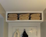 Одного клея будет недостаточно, чтобы выдержать вес всех элементов, которые будут храниться на полках: гостевые полотенца, туалетная бумага в рулонах, запасные бутылки шампуня, и многое другое. После того, как клей высохнет, нужно скрепить полки тремя винтами со всех сторон. Совет: Предварительно просверлите небольшие отверстия, а затем вставьте винты, чтобы предотвратить древесину от растрескивания.