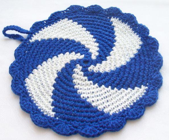 Совсем немного времени займет для создания круглой прихваточки. Ее можно использовать ка прихватку для кастрюль. Прихватку можно сделать побольше и потолще чтоб удобно было держать кастрюлю и необжечся. Для того чтоб сделать потолще, можно взять крючок и нитки большего размера. Вяжется она по спирали, а это очень легко и даже для начинающего не составит большого труда.