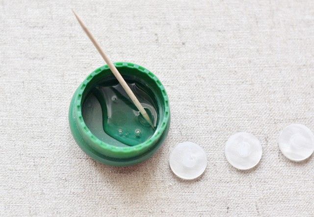 4. После того как клей готов быстренько (так как клей быстро затвердевает) наносим по капельке клея на каждую пуговку в центре.