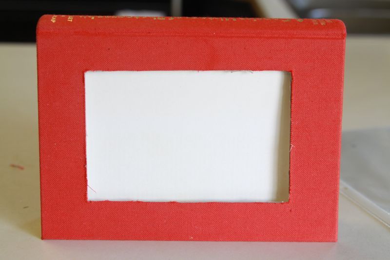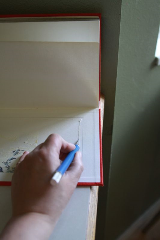 2. Используя X-ACTO нож, вырезать в обложке книги прямоугольник или квадрат в зависимости от фотографии. С ножом работать осторожно, медленно, чтобы не пораниться. Защитите поверхность под книгой, чтобы не попортить поверхность, на которой вы работаете.