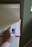 1. Откройте книгу разместите фотографию, используя карандаш и линейку обведите ее. Отступите примерно по 1 см от намеченного контура начертите контур будущей рамки, отверстие должно быть меньше, по всем краям, чем сама фотография, для того чтобы ее можно было вставлять.