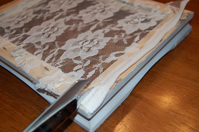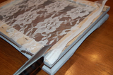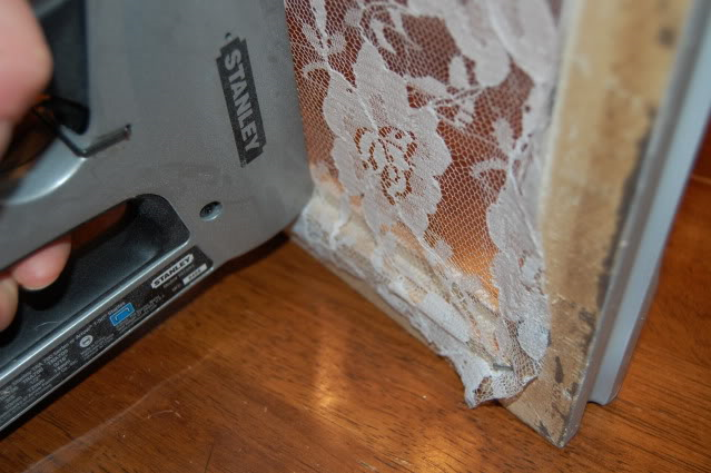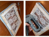 Слегка натягивая кружево закрепите углы при помощи степлера к обратной стороне рамки.