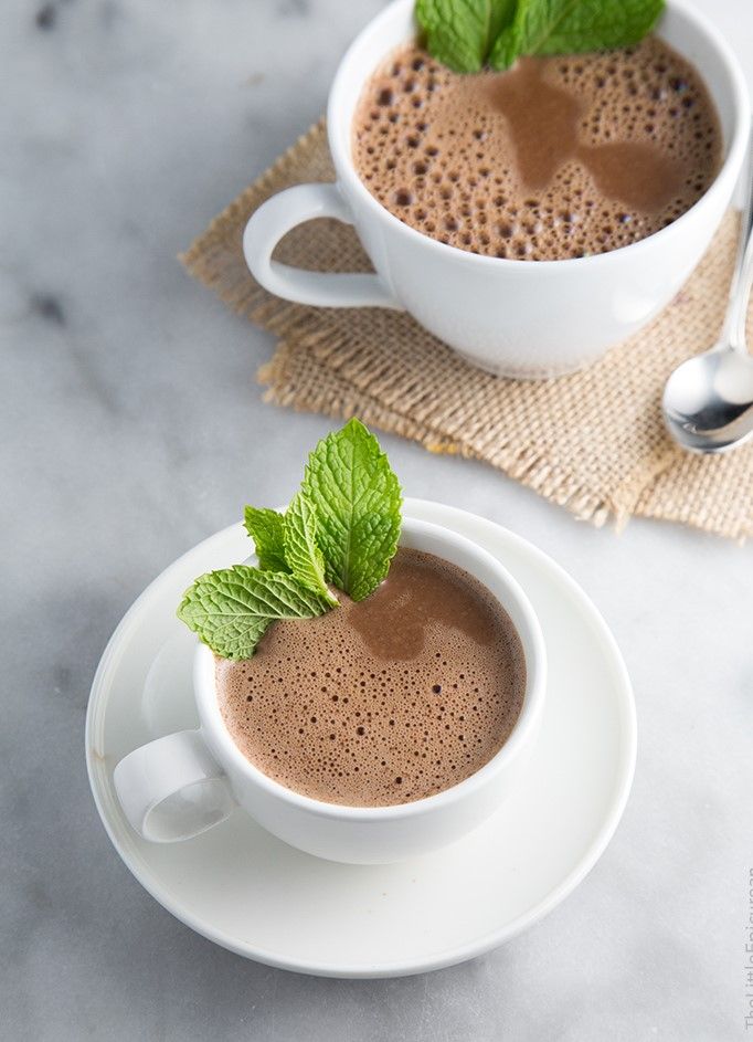 Подавайте вкуснейший горячий шоколад, украсив взбитыми сливками и несколькими листиками мяты. Приятного аппетита и уютных осенних/зимних вечеров!