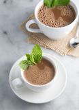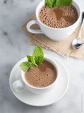 Для начала вам нужно вскипятить молоко в небольшой кастрюльке и бросить туда кусочки мятных листьев. После этого кастрюльку нужно снять с огня, накрыть крышкой и оставить настаиваться около часа. Затем молоко нужно процедить с помощью сита, отжать мяту, чтобы она могла отдать еще больше аромата, а затем ее можно доставать и выбрасывать. После этого необходимо снова вернуть молоко в кастрюльку, поставить на огонь, добавить какао, ложечку сахара и варить около 2 минут. Затем можете снять кастрюльку с плиты, добавить 50 г горького шоколада и оставить напиток постоять около 1 минуты. Теперь его нужно тщательно перемешать и взбить в помощью венчика до появления пенки. Готово!