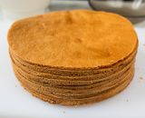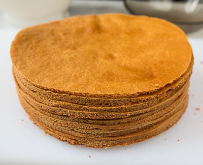 Пока корж еще горячий, возьмите обыкновенную крышку от кастрюли подходящего диаметра и по ней вырежьте коржи, обрезки не выбрасывайте!