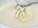 Взбивайте массу добела, это займет примерно три минуты. Затем добавьте весь мед и соду, размешайте.
