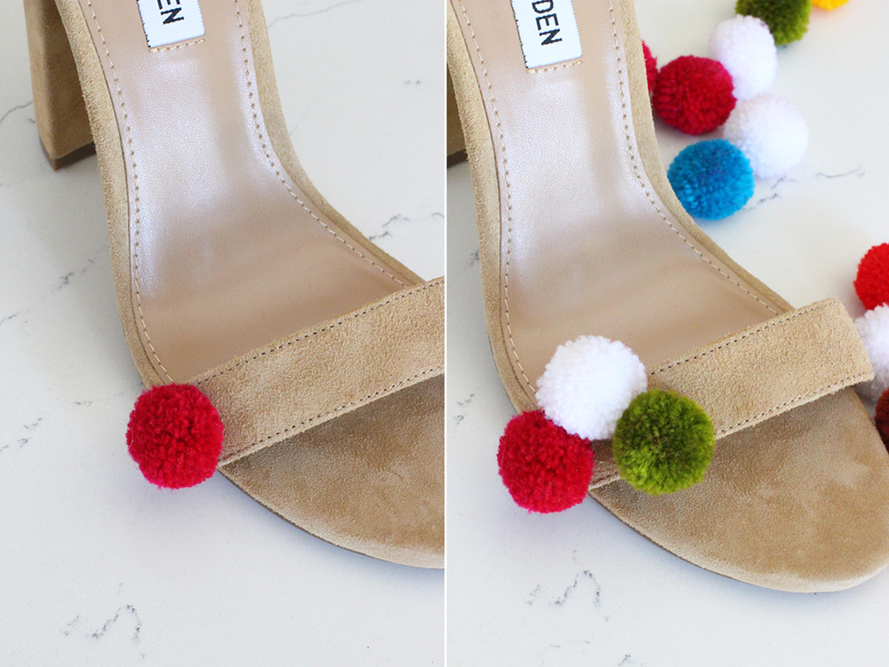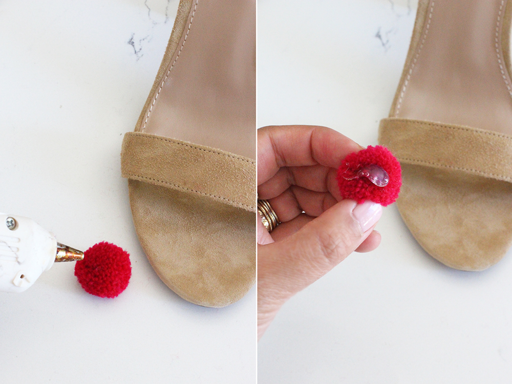 Несколько советов относительно клея. Горячий клей является самым простым и быстрым способом прикрепить помпоны к вашей обуви. Тем не менее, замша является гораздо более предпочтительной, чем кожа, так как горячий клей схватывается на текстурированной поверхности лучше, чем на гладкой. Если вы приклеиваете к гладкой кожаной обуви, тогда лучше использовать E6000. Это потребует немного больше времени, так как необходимо подождать пока приклеиться предыдущий ряд, перед добавлением следующего. Для этой конкретной пары, использован горячий клеевой пистолет. Поместите горошину горячего клея на помпон и приклейте его по центру ремешка, начните с одного конца.