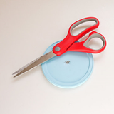 6. В центре пластиковой крышки сделайте круглое отверстие в диаметре около 1 см. Используйте ножницы и иглу или шило, для этого иглой нанесите контур отверстия, затем ножницами пробейте отверстие.