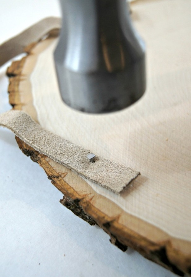 5.В данном случае для подвески используется замша. Вы можете легко использовать пряжу, шпагат и т.д. Прибейте по обе стороны с задней части среза дерева небольшими гвоздями, которые не пробьются на лицевую часть.
