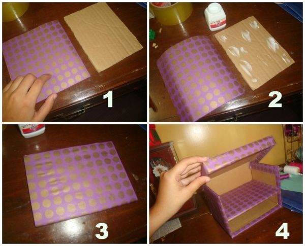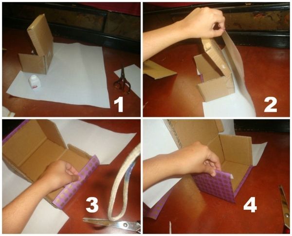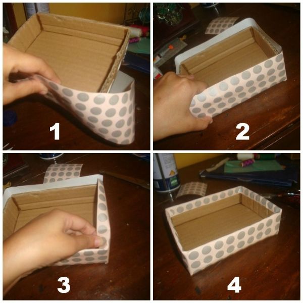 3) Точно также боковины надо сложить и хорошо зафиксировать клеем. Получившееся изделие можно декорировать узорами, цветной бумагой, или даже аппликацией. Аналогично можно обклеить шкатулку снаружи. Можно взять бумагу того же цвета, что использовали для оклейки ящичка, а можно сыграть на цветовом контрасте.