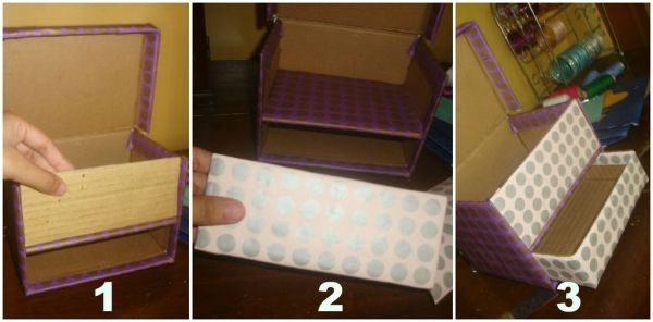Чтобы сделать несколько два и больше отделений, необходимо подобрать кусок картона нужного размера, также оформить обе го стороны листами цветной бумаги, а потом приделать его внутри коробки.