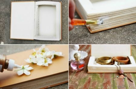 2) После того, как с вырезанием геометрических фигур закончено, страницы надо склеить друг с другом. Более тщательно промазав клеем страницы возле корешка книги. Клей должен высохнуть, для этого можно даже положить будущую шкатулку под гнет. Затем можно декорировать обложку будущей шкатулки искусственными цветами и добавить другие украшения. После того, как все сделано, можно сложить украшения в новую чудесную шкатулку.