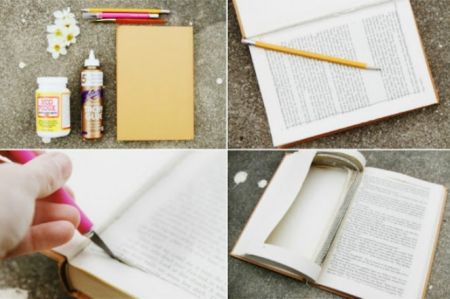 1) Книгу следует раскрыть точно посередине начертить прямоугольник, лучше это сделать с помощью линейки и карандаша. Расстояние от сторон фигуры до края книги должно составлять 1,25 см. Четко по линии ножом вырезают отверстие. Затем, перевернув страницу, прорезают новый прямоугольник такого же размера. Количество вырезанных на страницах прямоугольников может варьироваться. Главное, чтобы в итоге получилось углубление подходящего вам размера. Не страшно, если края прямоугольников будут слегка выступать.