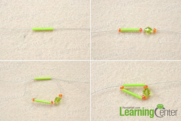 3. Добавить оранжевую бисерину на одну проволоку, добавить оранжевую бусину и 6 мм стеклянную зеленую бусину, и оранжевую бисерину на другой конец проволоки снова, а затем перекрестить провода и завести концы в первый зеленый стеклярус, и затянуть.