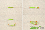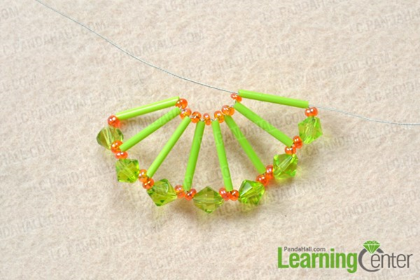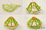 2. Добавьте оранжевую бусинку на каждый провод, и добавьте 6 мм зеленую бусину и еще одну оранжевую только с одной стороны, скрестить концы и в оба конца завести зеленый стеклярус, затем повторить процесс еще семь раз.